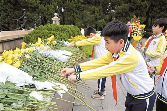 ■4月4日,青少年在广州起义烈士陵园向纪念碑献花。 新快报记者林里/摄 |