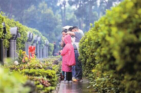 4月5日上午,清明正日小雨纷纷,在广州银河公墓,市民携家带口冒雨前来祭扫。