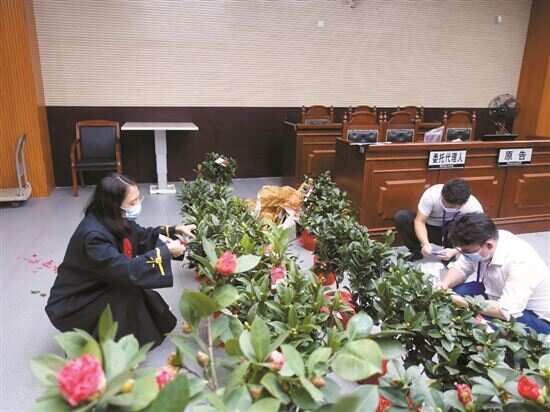 ■法庭主持双方当事人当庭对山茶花植株芽叶进行随机采样。 |