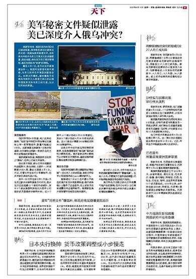 据新华社电 美国《纽约时报》近日接连报道,推特等多家社交媒体近来出现一批疑似美军秘密文件,涉及俄乌冲突中乌克兰方面兵力及武器配置、战场地图、俄乌双方伤亡情况等情报,甚至包括标有“绝密”的情报。