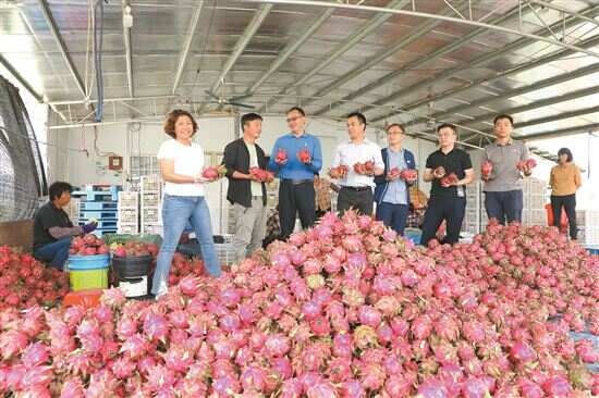 ■火龙果是阳江阳春市三甲镇罗村村的“一村一品”,来自阳春的水果批发商阮女士(左二)前来收购火龙果。 |