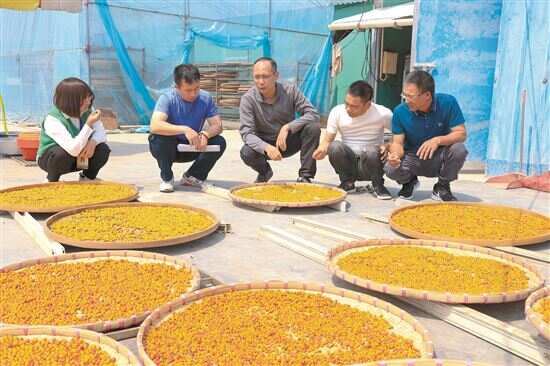 ■李彦光与工作队员、育苗基地工作人员一道挑拣晾晒好的山桔果干。 |