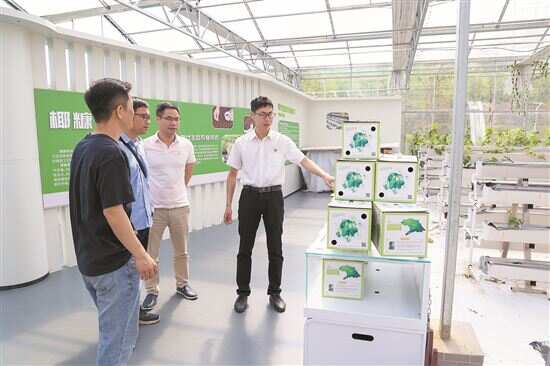 ■凉瓜田园综合体采摘棚外,许涛(右)和同事们商议杜阮凉瓜的包装改进。 |