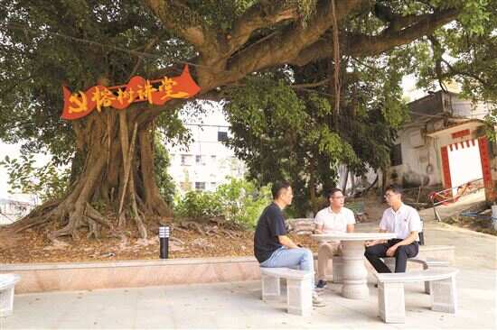■许涛(右)与村干部在榕树讲堂讨论如何进一步提升杜阮村人居环境、公共服务水平等。 |