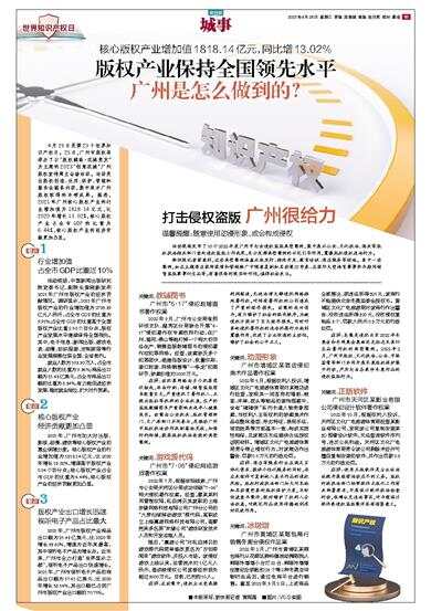 核心版权产业增加值1818.14亿元,同比增13.02% 4月26日是第23个世界知识产权日。25日,广州市版权局举办了以“版权赋能·花城竞发”为主题的2023“创意花城”广州版权宣传周主