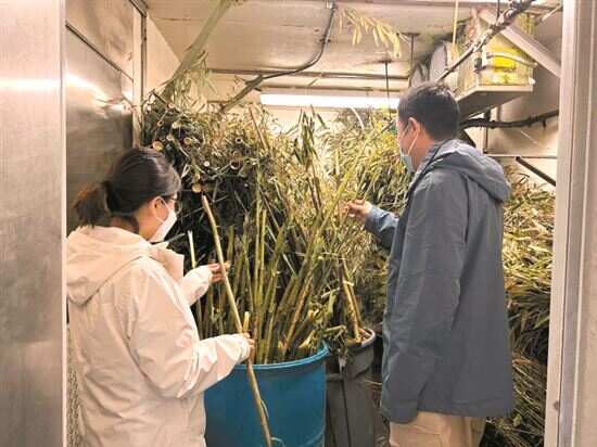 ■4月12日,北京动物园工作人员正在检查“丫丫”食用的竹子。 |