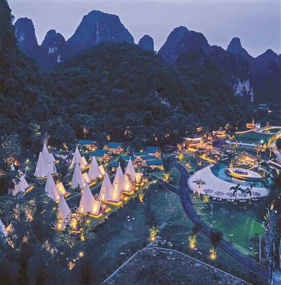 阳朔首家山水笙美星空下帐篷度假酒店日前迎来试业。酒店位于遇龙河十里画廊C位,占地面积近80亩,三面环山,具有很强的东南亚的风格。酒店分为静态生活区与娱乐动感地带,其中高顶东南亚帐篷是酒店的主力房型,一大一小两个空间衔接成一顶帐篷,帐篷内部面积为35平方米左右,空间感足够。而在娱乐区,模仿海岸线的泳池在人工沙滩与酒吧之间,入夜户外酒吧有驻场乐队,十分浪漫。