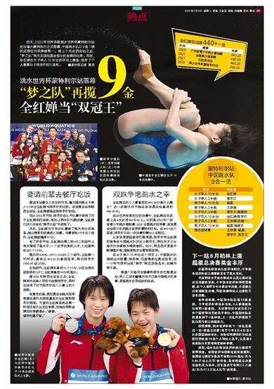 跳水世界杯蒙特利尔站落幕 昨天,2023年世界泳联跳水世界杯蒙特利尔站在加拿大蒙特利尔正式落幕,中国跳水队以9金1银的成绩位列奖牌榜第一。继上个月在西安站之后,“梦之队”再次实现包揽全部9枚金牌的壮举。同时,全红婵在女子单人10米台的项目上摘金,结束了个人赛事对于陈芋汐的六连败。 ■新快报记者 高京 要请前辈去餐厅吃饭 要说本站最令人关注的对决,毫无疑问是女子单人10米台全红婵与陈芋汐的比拼。东京奥运会和陕西全运会,全红婵都是战胜陈芋汐夺冠。 但从2022年开始,陈芋汐在公开比赛中保持了对于全红婵的四连胜,再加上两次队内测试赛,全红婵已好久没有在“婵芋大战”中获胜了。 为此,全红婵对于本次比赛做了极为充分的准备,她以榜首的成绩进入决赛。决赛首轮107B这个动作,全红婵就摘得87分。 有了好的开始,全红婵在第二轮407C的动作上再次展现了高水平,一个近乎完美的入水,七位裁判给出5个10分。 随后的6243D、207C、5253B三个动作,全红婵一气呵成,最终以458.20分拿到冠军,领先陈芋汐(438.90)近20分。 五轮动作,全红婵共拿到12个10分,以往出现失误较多的207C,全红婵拿到99分的高分。 继2021年陕西全运会之后,全红婵再次在单人项目中击败陈芋汐,同时也结束了对于陈芋汐在个人赛上的六连败。 有意思的是,悉尼奥运会跳水冠军李娜此前作为颁奖嘉宾为全红婵和陈芋汐颁奖。可爱的全红婵虽然在第一时间没有认出这位前辈,但她在领取金牌后对李娜表示:“谢谢,请你吃餐厅饭。” 双姝争艳跳水之幸 全红婵这次个人赛拿到的458.20分是什么概念?这一成绩仅次于她在东京奥运会拿到的466.20分。 在以往所有参加过的决赛中,全红婵在总成绩上共4次达到440分以上。分别是2020年广东省青少年跳水锦标赛、2021全国跳水冠军赛、东京奥运会和今年的跳水世界杯蒙特利尔站。在440+这个层面,陈芋汐只在一次决赛的舞台上实现过。 从东京周期延续到巴黎周期,陈芋汐和全红婵的竞争在中国跳水队历史上都罕见,两位天才少女每次对决都极为精彩激烈。如今,两名选手更是不断调高水准,谁能取胜完全看临场发挥。 在女子单人10米台这个项目上,中国跳水队涌现出伏明霞、陈若琳、任茜等多位奥运冠军,但一个时代同时出现“婵芋”两名顶级选手,的确非常不易。 展望7月福冈世锦赛和明年的巴黎奥运会,两人之间的巅峰对决不仅是中国跳水的幸事,更是跳水这项运动的佳话。 【全红婵总成绩440+一览】 时间 赛事 成绩 2020 广东省青少年跳水锦标赛 443.25 2021 全国跳水冠军赛 440.85 2021 东京奥运会 466.20 2023 跳水世界杯蒙特利尔站 458.20 【蒙特利尔站中国跳水队9金一览】 项目 夺金者 女子单人10米台 全红婵 女子单人3米板 陈艺文 男子单人10米台 杨昊 男子单人3米板 王宗源 女子双人3米板 陈艺文/昌雅妮 女子双人10米台 全红婵/陈芋汐 男子双人3米板 王宗源/龙道一 男子双人10米台 杨昊/练俊杰 混合团体赛 王宗源、杨昊、陈芋汐、陈艺文 下一站8月柏林上演 超级总决赛奖金丰厚 在国际泳联改名为世界泳联后,今年跳水世界杯的比赛赛制发生了重大变化。 考虑到承办方的办赛成本以及比赛对运动员体能的消耗,今年跳水世界杯将缩短赛程,在个人赛环节中不再设半决赛,小组赛之后直接就是决赛,而团体赛和双人比赛则只设有决赛。 去年世锦赛,中国跳水队狂揽13枚金牌。今年世界杯首战在西安,9人参赛的队伍拿到9枚金牌。本站蒙特利尔站共有20多个国家和地区的选手参加,中国跳水队在这里复刻了9金神迹,又一次让外界领教了队伍无与伦比的统治力。 按照赛程,跳水世界杯的下一站也是最后一站(超级总决赛)将于今年8月4日至6日在德国柏林举办。西安站和蒙特利尔站成绩优秀的前18名个人和双人选手,以及前8名的队伍有资格前往柏林参赛。 据悉,运动员在每站世界杯的比赛都可拿到奖金。按照世界泳联制定的奖金规则,前两站比赛冠军最高可拿到5000美元(约为3.45万元人民币)的奖金,最终超级总决赛奖金则更为丰厚,冠军最高可拿到2.5万美元(约为17.3万元人民币)的奖金。 ■本版图片:新华社
