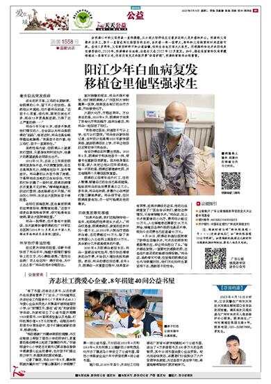 温暖1558号 ●温暖诉求 余明满心中的父母形象一直很模糊,从小到大陪伴他左右最亲近的人是外婆和外公。明满的父母都外出务工,孩子一直留在阳江海陵岛的农村,由外婆一粥一饭带大,每年和父母相聚的时间屈指可数。在他5岁那年,父母终因种种不和分道扬镳,他的生活也没有太大改变。但残酷的命运并未因他身世凄苦绕行,2018年,明满确诊白血病,治愈后又在2022年10月复发。如今,摆在他面前的仅有骨髓移植这一条路可以走,但若没有充足的医疗费“保驾护航”,明满的前路将凶险重重。 毫无征兆突发疾病 成长的岁月里,父母的长期缺席,给明满的心中,留下不小的创伤。虽然他从未提起,但外婆郑朵知道,“这孩子心思重,很内向,跟我交流也不多,现在13岁更是叛逆期,又得了这么严重的病……” 郑朵今年只有51岁,很多不熟悉他们情况的人,总会误以为郑朵是明满的“妈妈”,每到这时,郑朵总是会略带尴尬地解释:“我是孩子的外婆,他父母忙,孩子一直跟我住。” 虽然性格内敛,但明满从小就喜欢打篮球,只要身体和时间允许,他最大的愿望就是去球场出出汗。 2018年10月,正在上三年级的明满突发身体不适,不仅频繁发烧,而且总是浑身无力,伴随有拉肚子、发冷等症状。郑朵最初以为孩子得了流感,于是带他在当地的卫生站诊治,可吃药打针折腾了一段时间,明满的病情反反复复不见好转。“精神越来越差,别说打篮球,连走路都迈不开腿。”郑朵忧心忡忡,决定去大医院给孩子做检查。 在阳江滨海医院,医生拿到明满的血常规报告,微微皱起眉,“这孩子很多血象指标有异常,很可能患有血液病,要去大医院做检查。” 郑朵一脸愕然,但不敢有片刻耽误,当天就搀扶着明满赶往广州军区总医院(2018年11月更名为中国人民解放军南部战区总医院)就诊。 休学治疗幸运治愈 经过更为详细的检查,诊断书很快到了郑朵手中,她瞪大眼睛盯着报告上的文字,内心濒临崩溃。“急性白血病!怎么会这样?满仔的命,为什么这么苦?”郑朵的泪水夺眶而出。 面对残酷的现实,郑朵不得不接受,他们将明满转入广州医科大学附属第一医院,按照医生制订的治疗方案,开始接受化疗。 六期大化疗,疗程近两年。万分幸运的是,2020年6月,明满终于结束了所有化疗和加强疗,临床治愈后,和郑朵一起回到了阳江。 “我咨询过医生,知道孩子可以上学,也可以打篮球。”郑朵告诉新快报记者,当时的计划是等2020年新学期来临,就送明满回去上学,尽早让他回归正常的学习和生活。 命运仿佛在此时露出笑脸。2020年9月,明满终于和其他孩子一样,背着书包重新回到课室。因为他身高比较高,家人决定让他从四年级读起。唯一不同的是,明满还要继续吃药,并且每隔两个月需回医院复查。 明满的父母常年在外打工,但收入微薄,顾着自己的生活已是很勉强,能给到郑朵的生活费更是少之又少。多年来,郑朵祖孙俩,多靠外公在闸坡打散工赚钱养家。郑朵很节省,但对明满疼爱有加,尽一切可能满足他的需求。 旧病复发唯有移植 “如果不生病,我们还能陪伴他一些年,起码能把他养到长大成人。”郑朵叹息道,明满患病后,家里的经济状况一落千丈,从2018年入院治疗到临床治愈,总花费超过50万元,除了亲友和爱心人士在网上捐助的19万元,其余部分几乎都是借来的外债。 2020年6月明满治愈回乡后,郑朵一直都在省吃俭用,想尽快还清借来的治疗费,不给别人增加负担和麻烦。然而,郑朵的债还没还清,去年6月,明满在一次复查过程中,结果显示有异常,经再次确诊后证实,他的白血病复发了!“医生告诉我们,像他这种情况,只有做移植手术。”郑朵说,加上手术前要做的小化疗,费用估计超过10万元,入仓移植前还需要交25万元押金,移植后各种外购药也是买不停,现如今总花费也已经直逼50万元。 4月24日,明满在孙逸仙医院做了脐带血回输手术,可术后的排异和感染等反应,却让郑朵愁白了头。“每天都在发烧,一直要吃抗感染的药,这些在外面买药的钱都没得报销。”郑朵说,虽然借无可借,但坚强的明满还在仓内与病魔对抗,他们无论如何也要坚持下去,挽救孩子的性命。 公益指引 ●公益账户:广东公益恤孤助学促进会天天公益专项基金 ●银行账号:44032601040006253 ●开户银行:中国农业银行广州远洋宾馆支行 注:捐款时请注明“新快报温暖×号×××(受助者姓名)”, 如“新快报温暖1558号明满”。如需捐款收据,请在汇款时附注捐款收据回邮地址、联系人姓名及电话。 ■本版统筹:新快报记者 潘芝珍 ■本版采写:新快把记者 严蓉 潘芝珍 ■图片:受访者提供