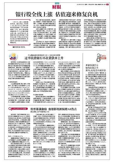 5月8日,A股三大指数集体收涨。截至收盘,沪指涨1.81%,报3395点,创年内新高;深证成指涨0.40%;创业板指涨0.25%。其中,银行板块涨幅居前,42只上市银行股票全部上涨。业内声音认为,近期银行股大涨主要受益于中国特色估值(中特估)体系低估值、高分红和高股息等原因,展望未来,国内银行估值有较大修复空间。 ■新快报记者 杨依泓 昨日,银行板块迎来普涨。截至收盘,中国银行、中信银行强势涨停,农业银行、工商银行、建设银行涨幅均超过5%。其中,中国银行和农业银行的收盘股价,均创出历史新高。 近来,金融股尤其上市银行股一直处于“涨涨涨”行情。4月以来,42只银行股几乎全部实现正增长。有15家银行累计涨幅超过10%,包括中信银行、邮储银行、民生银行、中国银行累计涨幅超过20%,交通银行、农业银行涨幅也均超过15%。 业内声音认为,受益于中国特色估值体系低估值、高分红和高股息等特点,今年国有大行股强势大涨。创金合信基金研究员胡致柏表示,本轮银行的行情,主要驱动因素是中特估主线下,低估值银行业绩基本面出现底部改善。“从基本面的角度看,银行板块一季度披露完毕,业绩低点已过,未来有望呈现逐季改善的趋势。以大行为代表的低估值银行,营收基本都实现了正增长,部分国有大行和股份行营收表现明显超出市场预期。”胡致柏认为,从资金面看,高股息、中特估产品新发,将提供资金子弹,同时中特估代表国有行估值低持仓少,资金流向阻力小。 鹏华银行ETF、银行指数LOF基金经理余展昌表示,展望未来,国内银行估值有较大修复空间,国企改革也将提高银行的利润增速,使得国有大行的估值有望修复。同时,银行承担社会责任也有利于提高效益。“大行承担部分社会责任和助力实体经济的长期发展是相辅相成的。国有大行通过延期还本付息等方式支持实体经济,尽管短期银行的利益受到一定的损失,但从长期来看,这有助于更多有活力的企业渡过难关。而从近年来的利润增速来看,国有大行在疫情后的利润增速反而比疫情前的利润增速更高,这更加证明了承担一定的社会责任并不意味着银行的效益下降。” 值得注意的是,即便银行股今年以来取得较好涨势,但目前不少银行仍然是“破净”状态,仅有宁波银行和招商银行市净率在1以上,邮储银行目前为国有大行股中市净率最高的银行,达到0.8左右的市净率。