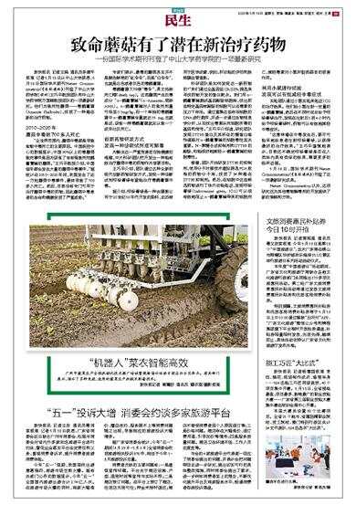 一份国际学术期刊刊登了中山大学药学院的一项最新研究 新快报讯 记者王娟 通讯员李建平报道 记者5月18日从中山大学获悉,5月16日国际学术期刊Nature Communications(《自然通讯》)刊登了中山大学药学院(深圳)王巧平教授团队和中山大学药学院万国辉教授团队的一项最新研究。他们为致死性蘑菇——毒鹅膏菌(Amanita Phalloides),找到了一种潜在新的治疗药物。 2010-2020年 蘑菇中毒致700多人死亡 “全世界范围内,蘑菇中毒都是导致食物中毒死亡的主要原因。中国疾控中心的数据显示,中国90%以上的毒蘑菇致死事件是因为误食了含有强致死性鹅膏蕈碱的蘑菇。”王巧平教授介绍,中国每年都会发生大量的蘑菇中毒事件,“据统计在2010-2020年间,我国发生了近一万起蘑菇中毒事件,最终导致了700多人死亡。然而,目前没有专门可用于治疗蘑菇中毒的药物,因此蘑菇中毒患者的生命和健康受到了严重威胁。” 专家们表示,最毒的蘑菇其实并不是颜色鲜艳的“红伞伞”,而是“白伞伞”,也就是白色或者灰色的毒鹅膏菌。 毒鹅膏菌又叫做“毒伞”,英文俗称死亡帽(death cap)。这类蘑菇产生巨毒成分 “α-鹅膏蕈碱”(α-Amanitin,简称AMA)。α-鹅膏蕈碱对人的致死剂量可低至0.1mg/kg,而一个单独的毒鹅膏菌中α-鹅膏蕈碱含量就达15 mg,也就是说,误食一株毒鹅膏菌就足以致一个成年壮汉死亡。 创新药物研发方式 发现一种诊断试剂或可解毒 为解决这一严重危害老百姓健康的难题,中大科研团队把开发出一种能有效治疗蘑菇中毒的药物作为首要目标。 王巧平介绍,团队通过这种全新的现代创新药物研发方式,发现一种诊断试剂吲哚菁绿有望能治疗毒鹅膏菌中毒。 据介绍,吲哚菁绿是一种由摄影公司于20世纪50年代开发的染料,此后被用于医学成像,例如,肝功能的评估和脉络膜血管造影。 科研团队是如何发现这一新药物的?“我们通过全基因组CRISPR筛选来寻找药物开发的蛋白靶点。我们用α-鹅膏蕈碱测试基因敲除细胞库,找出那些特定基因被敲除的细胞可以在毒素的压力下存活。通过富集这些存活细胞的DNA进行测序,并进一步通过生物信息学分析,从而找出毒素杀死细胞所需的基因和信号。”王巧平介绍道,研究团队发现STT3B蛋白及其所在的糖蛋白修饰通路对α-鹅膏蕈碱的细胞毒性至关重要。N-聚糖合成抑制剂和STT3B的敲除,均能很好地减轻α-鹅膏蕈碱的细胞毒性。 接着,团队开始研发STT3B的抑制剂,使用分子对接技术虚拟筛选FDA批准的药物分子库,找到了34种潜在STT3B抑制剂。然后,在细胞中这些候选药物进行了体外功能验证,发现吲哚菁绿(Indocyanine green, ICG)可以很有效地阻止α-鹅膏蕈碱带来的细胞死亡,减轻毒素对小鼠肝脏类器官的损害作用。 利用小鼠进行试验 发现可以有效减轻中毒症状 实验团队通过小鼠实验来验证ICG的治疗效果。他们给小鼠注射一定量的α-鹅膏蕈碱,然后在不同时间点给予吲哚菁绿治疗,发现在注射后1到4小时内给予吲哚菁绿时,药物可以有效地减轻中毒症状。 “这意味着在中毒发生后,要尽可能早地给患者注射吲哚菁绿,以获得最好的治疗效果。”王巧平谨慎地表示,目前还不确定吲哚菁绿是否在人类体内具有类似的效果,需要更多的临床证据。 5月16日,国际学术期刊Nature Communications(《自然通讯》)刊登了这一项最新研究成果。 Nature Communications认为,这项研究还为其他毒物解毒剂的开发提供了新的策略和方向。