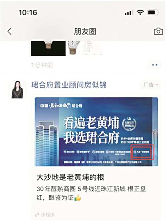 ■从业主提供的中鼎珺合府的户外广告、朋友圈广告等图片,均可以看到“九年一贯制”的宣传标语。 |