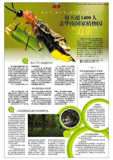 虫儿飞,虫儿飞,你在思念谁 “黑黑的天空低垂,亮亮的繁星相随,虫儿飞、虫儿飞……”到华南国家植物园追寻夜空中的点点浪漫萤光,是广州近期最受追捧的夜间活动之一。园区专家表示,今年虫子数量与往