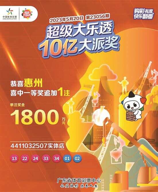 新快报讯 记者陆妍思报道 5月20日晚,体彩超级大乐透第23056期开奖,也是超级大乐透10亿元大派奖第18期开奖,全国中出3注一等奖,其中浙江省宁波市一幸运儿独揽一等奖1500万元派奖奖金,擒获1注3299万余元一等奖。同期惠州也中出1注1800万追加一等奖,可惜中奖彩票投注金额未满15元,无缘派奖。 3299万加料头奖落户浙江 大乐透第23056期的中奖号码为:前区“13、22、24、33、34”;后区“01、02”。本期全国共中出3注一等奖。其中,2注为1800万元(含1000万元基本投注奖金+ 800万元追加奖金)追加投注一等奖,落户广东惠州、浙江宁波,其中1注符合派奖参与条件,获得3299万元一等奖奖金(含派奖奖金1500万元),被来自浙江宁波的幸运儿中得。中奖彩票是一张“6+2”追加复式票,共收获奖金3302万元。这注一等奖是超级大乐透10亿元大派奖期间,中出的第4注3299万元一等奖。 惠州中出的1800万元追加投注一等奖出自博罗县戴屋小组小罗路282号的4411032507实体店,中奖彩票为一张2注号码、6元投入的单式追加票。另外1注为1000万元基本投注一等奖,落户湖南郴州。 当期二等奖开出60注,单注奖金为34.69万余元;其中36注采用追加投注,单注追加奖金27.75万余元,根据10亿元大派奖规则,本期共有36注二等奖符合参与条件还可获得派奖奖金,每注多得二等奖派奖奖金13.88万余元,分享派奖奖金后,二等奖单注总奖金为76.34万余元。 本期固定奖共派送奖金2193万元。本期开奖后,固定奖派奖余额为5892万元。 下期一等奖派送1500万元 本期全国销量为3.98亿元,为国家筹集彩票公益金1.43亿元。按照超级大乐透10亿元大派奖规则,本期1500万元一等奖派奖金额全部派送完毕,下期一等奖将继续派送1500万元。本期开奖后,奖池金额为9.20亿元。 超级大乐透10亿大派奖,所有奖级都派奖,奖金最高可翻番。进行追加投注且单期单张投注金额15元及以上即可参与本次派奖活动。 快乐购彩,理性投注。体彩中心提醒,毕竟中大奖是小概率事件,我们要保持一颗平常心、娱乐心、公益心来体验大乐透游戏。您所购买的每一张彩票,都会贡献一份爱心。以2元1注的体彩大乐透为例,就有0.72元成为彩票公益金。这些公益金用于补充全国社会保障基金、乡村振兴、教育助学、医疗救助、红十字事业等民生领域。