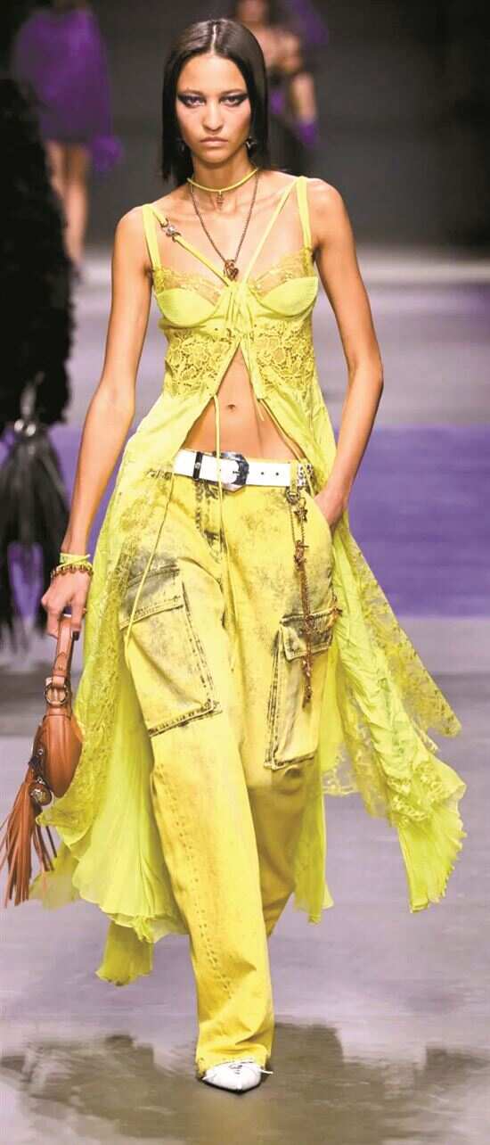 秀场搭配会选花纹或廓形较抢眼的下装以此来弱化薄纱上装带来的性感印象。 |