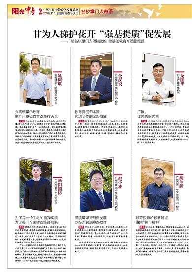 ——广州名校掌门人领航赋能 助基础教育高质量发展 姚训琪 华南师范大学附属中学校长 办高质量的教育 做广州基础教育改革排头兵 寄语 学生自主学习,拓展潜能,全面发展。教师德艺双馨,舒心工作,潜心育人。校园动静和谐,扬志学园,和悦家园。学校美誉长青,国内一流,世界知名。要办高质量的教育,就是要办好家门口的每一所学校,来满足人民群众对美好教育的向往和需求。作为一所坐落在广州的省属名牌学校,华附为广州基础教育的高质量发展贡献力量,既是责无旁贷,也是理所当然。华附理应以敢为人先的传统展开积极探索,成为广州基础教育改革中起到示范引领作用的排头兵。 欧阳国防 广州市第八十六中校长 为了每一个生命的自我实现 为了每一个生命的终身发展 寄语 博观而约取,厚积而薄发。回过头看,初中三年的寒窗苦读,有波涛汹涌的激荡,有静水流深的酝酿,都在稀松平常的求学日里,标记了无数有价值的时间刻度。现在,你们迎来了人生的又一次转折。志存高远是你们不变的青春底色,逐梦筑梦是你们不懈的追求,实现超越是你们与命运的较量。 作为一所拥有67年办学经验和雄厚师资力量的中学,广州市第八十六中学始终秉承着“为了每一个生命的自我实现,为了每一个生命的终身发展”的办学理念,以海纳百川的襟怀、勇于创新的气魄、脚踏实地的作风、锐意进取的精神、止于至善的追求,全力打造广州东部教育“桥头堡”。欢迎你加入八十六中,与我们一起,去增加生命的厚度。 全汉炎 广东实验中学党委书记、校长 教育要回归本源 实现个体的全面发展 寄语 教育要回归本源,去功利化,教育的意义在于点燃一把火,让学生唤醒自我,发展自我,成就自我,这是教育的至臻境界。学生是完整的人,教育不仅要实现个体在智力和职业能力方面的发展,而且要实现个体在生理、社会、道德、伦理、创造性、精神各方面的发展。 赵小成 广州市真光中学党委书记、校长 抓质量谋提升促发展 办好人民满意的教育 寄语 学生成才、教师成长、学校发展,是教育人为之不懈奋斗的教育理想、教育情怀、教育追求。真光中学以“管理科学化,育人优质化,特色品牌化”为工作目标,聚焦抓质量,专注谋提升,促进学校教育高质量发展。 未来将重点加强师德师风建设,提高教师政治站位;加强学生理想信念教育;重点推进依法治校,加强学校规范管理,推进学校教育现代化,办好人民满意的教育。 龙国华 广东广雅中学校长 广雅,让优秀更优秀 寄语 我们始终相信,着眼于学生更长远的未来,为学生终身发展赋能的教育,才是好的教育。学校不应只是提高应试分数的教育场所。一所好的学校,是能让学生在其中蓬勃生长的。广雅为学生的多元成长提供多样化的平台,校园里不仅有琅琅读书声,还有运动场上的笑声和呐喊声,这就是最好的青春校园。在广雅,你将拥有优美的校园,优质的课程,优秀的教师——广雅,让优秀更优秀! 胡革新 广州市第一中学党委书记、校长 翘首教育阶段新起点 赓续“第一精神” 寄语 全力以赴,青春无悔。那些堆叠成山的本子,记录着你奋笔疾书的印记;那个教室里的钟表,见证过你分秒必争的努力;那个夹杂着阳光与青草味道的操场,留下过你奋力向终点冲刺的汗水。属于中考的那个夏天即将变成昨天,但未来仍会有无数个与内心一样炽热的夏天与你相拥。带上理想与信念、自信与坚强、勤奋与努力,与广州市第一中学相遇。同学们,站在广州一中建校95周年的新起点,我们真诚地向你发出邀请。今年九月,愿与你携手,赓续“第一精神”,传承“院士风范”,聚焦高质量发展,勇攀新高峰,尽显青春风采。
