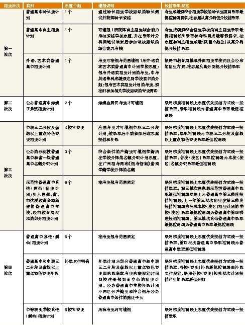 随着教育高质量发展,如今的考试除了要保证公平公正,也强调能普惠来自多种生源、奔赴多种升学途径的考生。备受关注的2023年广州中考大幕已经拉开,今年录取规则有何变化?各批次招生计划情况如何?《阳光中考》带你快速了解2023年中考热点,了解今年的中考政策和趋势,以期让考生志愿填报更加胸有成竹。 ■采写:新快报记者 邓善雯 关键词: 录取规则 今年广州市中考继续采用梯度控制线上志愿优先投档方式统一投档录取(即多梯度投档录取)。各批次及类别计划按下表从前到后顺序进行投档录取。即先对第一批次的特长生计划、自主招生计划、外语和艺术类计划、港澳子弟班计划、中职三二分段及省级以上重点特色专业招生计划依序进行投档录取;再对第二批次计划、第三批次计划、第四批次的普通高中学校其他(剩余)招生计划依序进行投档录取;然后对普通高中、中职三二分段及省级以上重点特色专业补录计划依序进行投档录取;最后对中职学校其他(剩余)招生计划进行投档录取。考生一旦被前面的志愿学校(不论公办高中、民办高中、中职学校)录取,则不再参加后续志愿投档。 关键词: 第一梯度投档控制线 今年中考在实施层面对两个数字进行了调整,一是划定普通高中第一梯度投档控制线的人数占报考总人数比例从12%调整为9%,二是名额分配录取最低控制分数线下降分值从原来的20分调整为40分(一个梯度间隔)。 自实施“新中考”以来,名额分配已成为户籍生升入优质公办高中主要途径。普通高中在第一、第二批次投档后的剩余计划减少,在第三、第四批次招生的计划占比相对降低。加之中考报名情况变化较大,为了适应新情况,使考生志愿满足度更高、更加适配预期,需要调整普通高中第一梯度投档控制线划定比例。2023年,以降序排列在报考总人数9%位置(去尾取整)的考生成绩作为普通高中第一梯度投档控制线。