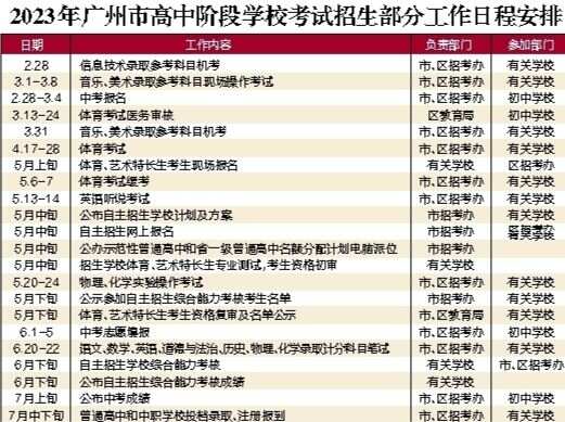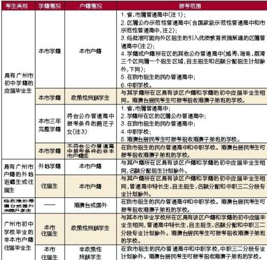 注: 1.省、市属普通高中:华南师范大学附属中学、广东实验中学、广东广雅中学、广州市执信中学、广州市第二中学、广州市第六中学、广州市铁一中学、广州大学附属中学、广州协和学校、广东华侨中学、广州市艺术中学、广州外国语学校、清华附中湾区学校。具体学校名单以《报考指南》为准。 2.区属公办示范性普通高中和经批准可面向外区招生的引入优质教育资源新建的区属普通高中:面向全市招生,但面向外区户籍生(含政策性照顾学生)招生的人数不能超过本校当年招生计划的15%。具体学校名单详见《报考指南》。 3.符合公办普通高中报考条件的随迁子女:具有我市三年初中完整学籍、父母一方或其他监护人持有在我市办理且在有效期内的《广东省居住证》的非本市户籍初中应届毕业生。省、市属和越秀、海珠、荔湾、天河区属公办普通高中招收此类考生的计划为该校当年招生计划的8%至15%,白云、黄埔、番禺、花都、南沙、从化、增城区属公办普通高中招收此类考生的计划为该校当年招生计划的8%至18%,区属公办普通高中的具体比例由各区根据实际情况确定,省、市属公办普通高中的具体比例由学校自行确定。 4.符合名额分配报考资格的考生,按其学籍所在区填报名额分配志愿,可填报名额分配到本校的普通高中学校志愿。 5.往届生不可报考特长生、自主招生、名额分配和中职三二分段专业计划。