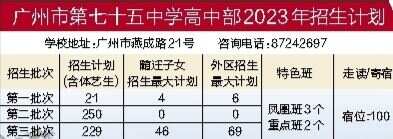 广州市第七十五中学创建于1956年,是一个拥有三个校区的省一级完全中学,是广州市示范性高中。学校在“责行天下”的校训引领下,坚持“为每一个人全面而自由发展奠定基础”的办学理念,以学生为中心,全面实施素质教育,使学生的潜能得到充分发掘,个性得到充分施展。 学校先后获评“全国创建民族团结进步示范学校”“全国科研兴教示范基地”“广东省青少年校园足球推广校和全国青少年校园足球特色学校”“广东省中小学艺术教育特色学校”“广州市教育工作先进单位”等称号。 七十五中以“凤凰涅槃”的决心,创建老百姓家门口的优质示范学校。今年七十五中计划招收高一新生500人,其中天河区外的学生占15%。未来,七十五中将不断提升办学内涵,以奋进之笔写好教育答卷,推动教育高质量发展。