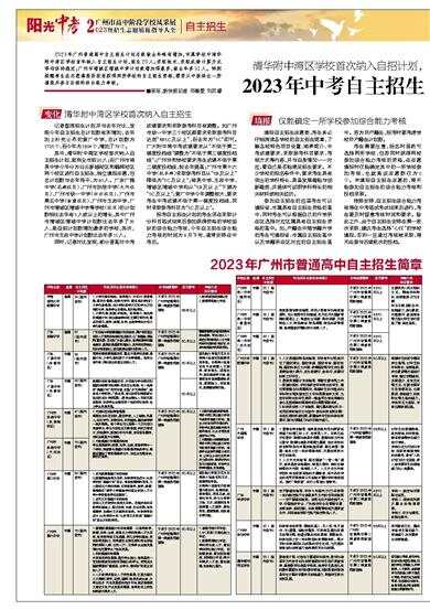 清华附中湾区学校首次纳入自招计划, 面向全市招20人 2023年广州普通高中自主招生计划总数较去年略有增加,市属学校中清华附中湾区学校首年纳入自主招生计划,招生20人;录取批次、录取成绩计算方式等均保持稳定;广州市增城区增城中学计划数增加得最多,较去年多31人。特别提醒考生在志愿填报阶段若获得两所学校的自主招生资格,需要从中抉择出一所填报并参与后续的综合能力考核。 ■采写:新快报记者 邓善雯 刘芯睿 变化 清华附中湾区学校首次纳入自主招生 记者查阅招生计划并与去年对比,发现今年自主招生总计划数有所增加,去年加上补充公布的黄广中学,总计划数为1725个,而今年为1804个,增加了79个。 其中,清华附中湾区学校首次纳入自主招生计划,面向全市招20人;而广州市培英中学今年分为白云新城校区和鹤洞校区两个校区进行自主招生,独立填报志愿,但总计划数与去年持平,为60人。广东广雅中学(花都校区)、广州市执信中学(天河校区)、广州市铁一中学(白云校区)、广州市第五中学(金碧校区)、广州市玉岩中学、广州市增城区增城中学等学校(校区)的计划数相比去年有5人或以上的增长,其中广州市增城区增城中学计划数比去年多了31人,是自招计划数增加最多的学校,其次,广州市玉岩中学计划数比去年多11人。 同时,记者对比发现,部分普高对中考成绩要求和录取参考科目有调整。如广州市铁一中学三个校区都要求录取参考科目达到“4B1C及以上”,而去年为“5C”即可。广大附中将中考成绩要求从“不低于第二梯度投档线”调整为“不低于第三梯度投档线”;广州协和学校要求考生成绩不低于第二梯度投档线,较去年提高;广州市第十六中学(校本部)录取参考科目从“5B及以上”降低为“5C及以上”;培英中学、玉岩中学、增城区增城中学均从“5B及以上”下调为“5C及以上”;黄广中学今年调整较大,要求考生中考成绩不低于第一梯度投档线,同时录取参考科目为“5C及以上”。 报考自主招生计划的考生须在录取计分科目笔试结束后参加获得资格的学校组织的综合能力考核,今年自主招生综合能力考核的时间为6月下旬,通常安排在中考后。 填报 仅能确定一所学校参加综合能力考核 填报自主招生志愿前,考生务必仔细阅读各学校的自主招生简章,了解各校特色项目设置、培养简介、中考成绩要求、录取参考科目要求、考核方式等内容,并与自身情况一一对应,看自己是否能满足招生要求。不少学校的报名条件中,要求考生具有突出的学科特长、具备发展潜能与创新潜质,并提供可说明学科特长的相关材料或相关经历。 参加自主招生的应届考生可以填报省、市属具有自主招生资格的高中,同时考生可以根据自己的升学所在区选择对应区属具有自主招生资格的高中。如,户籍生中随学籍升学的考生可填报省、市属自主招生高中以及学籍所在区对应的自主招生高中。若为非户籍生,报考时要考虑学校非户籍生计划数。 考生需要注意,报名时虽然可选择两所学校,但若同时获得两校参加综合能力考核的资格,在志愿填报时仅能确定其中的一所学校参加考核,也就是说志愿数仅为1个。未填报自主招生志愿的,将不能参加自主招生的综合能力考核和投档录取。 按照安排,自主招生综合能力考核将在中考笔试考试结束后进行,考生要及时留意考核时间和要求。除此之外,由于自主招生安排在第一批次录取,建议考生选择“心仪”的学校填报,否则一旦通过考核被录取,将无法参与后续批次的投档。