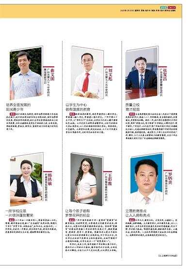 曲文国 广州市第九十七中学校长 兼党委副书记 培养全面发展的阳光青少年 寄语 我们的新生态课堂,助你培养创新能力和自我表达能力;我们的社团活动和综合实践活动,助你培养特长发展、团结协作的精神;我们在学校里营造积极向上的求学氛围,让你在德智体美劳各方面积极上进、全面发展,争做有理想、勇担当、敢作为、富有行动力和创造力的阳光青少年。 韩轶敏 祈福英语实验学校副校长 一所学校应是一片绿洲蓬勃繁荣 寄语 三十年如一日教书育人,荣誉等身痴心不改;管理、教学重担在肩,潜心“生态德育”成果初现;惟愿天下学子“学贯中西、回报社会”,向阳而生、向善而行。一所学校,应该是一片绿洲,有生命的气息,有成长的痕迹,更重要的是要有生生不息、蓬勃繁荣的教育生态。 刘文彪 广州市第七十五中学校长 以学生为中心做有温度的教育 寄语 做有温度的教育,就是带着责任心教化学生,带着童心融入学生,带着爱心感化学生。广州市第七十五中学,以“责行天下”为校训,在责任文化的土壤中赓续红色血脉。以历史的大视野来读懂责任,以时代的新标尺来认清责任,以人民的新期待来强化责任。强国有我,不负韶华。从课堂和校园,到走向社会,七十五中用爱与责任与青春同行,让时间见证成长的力量。 王彩霞 广州市海华高级中学校长 让每个孩子都有梦想花开的机会 寄语 广州市海华高级中学一直秉承“宽教育”的教育理念,让视野更宽,与梦想更近是教育的追求;择高而立,向宽而行是教育最舒展的姿态。坚持将“宽教育”的理念深度融入学校的特色发展之中,推进宽德育、宽课堂、宽学习、宽管理。宽教育是以宽为手段和以宽为目的的素质教育之实践样态,对于学生而言,是让学生在活动中发挥自主性和能动性,在细节情境中去感悟和体验,让学生成为一个“有宽度的人”。 同学们,未来三年,海华高级中学的舞台属于你们,愿你们从心所欲而不逾矩,勤学善思而不自满,全面发展而不懈怠;让自己从平凡变为优秀,从优秀变为卓越。 张复昌 广东龙涛教育集团总校长 质量立校 育才报国 寄语 全省高质量发展大会向全省人民发出了高质量发展的动员令,振奋人心!风劲潮涌,自当扬帆破浪;任重道远,更需策马加鞭。新的一年,我们将凸显集团化办学的优势,秉承“质量立校,育才报国”办学理念,以肇庆龙外、恩平黄冈、广州龙外、从化龙外(原广州南洋英文学校)四旗舰校为核心,打造品牌教育标杆,带动集团旗下所有学校持续提质升级,高质量发展。通过努力,力争三至五年内形成广州、肇庆、江门三足鼎立有影响力的教育集团,五至十年在粤港澳大湾区乃至广东省铸就品牌教育集团。 罗炳炎 广州市海珠中学校长 立足教育原点 让人人拥有亮点 寄语 百年大计,教育为本。五育并举,立德树人。因材施教,培根铸魂。立足教育原点,回归教育本真,让人人拥有亮点,为学生终身发展奠定良好的思想道德、行为习惯、学识能力基础。惟愿凤翥龙翔,期盼桃李花香。山趋水会,皆成风景。人生的风景隐现于恰如其分的选择路上。选择别样的遇见,在海珠遇见更好的自己。 (以上排序不分先后)