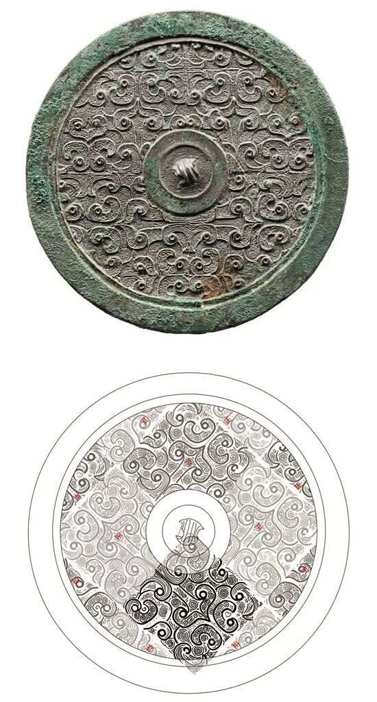 ◀战国羽状雷云纹镜及其地纹线描图 |