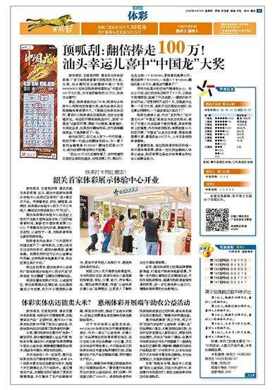 新快报讯 记者陆妍思 通讯员汕头体彩报道 广东又有购彩者喜中顶呱刮百万大奖,日前,汕头潮阳区谷饶镇饶中路17号的4404030372实体店购彩者惊喜刮出“中国龙”100万元大奖,为本地贡献税收2