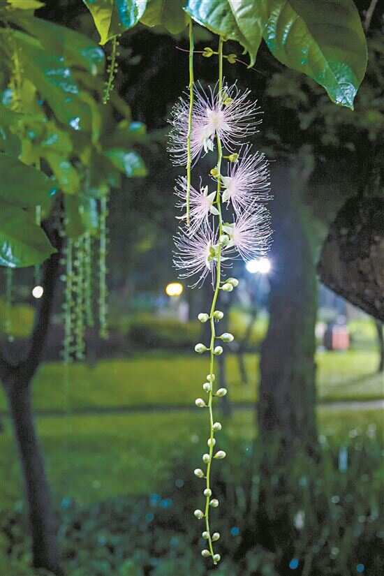 新快报讯 记者王彤 通讯员林园轩报道 最近,珠江公园百花园里一种花期只有一晚的“奇花”玉蕊悄然绽放。 珠江公园于2018年引进栽种被称为“月下仙子”又名“琼花”的玉蕊。玉蕊属常绿小乔木,花白色或粉红色、粉紫色,有着长而悬垂的穗状花序,近嗅有清香。刘禹锡的《和严给事闻唐昌观玉蕊花下有游仙二绝》之一就写道:“玉女来看玉蕊花,异香先引七香车。” 玉蕊花开的时间一般为下午太阳落山后至第二天早上太阳出来前。傍晚花苞满满,半夜灿若烟花,清晨太阳升起花儿凋谢。掉落时的玉蕊花如同天女散花,美得短暂却不匆忙。 公园负责人介绍,玉蕊这段时间会陆续开花,16时后可以去偶遇早开的花蕾,第二天8时左右可以去邂逅迟落的盛花或者凋零的落花。