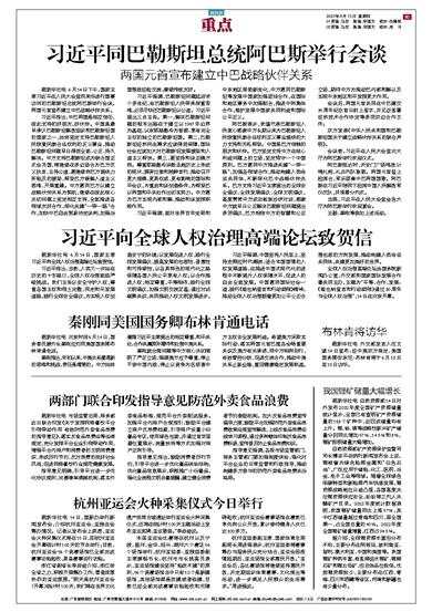 两国元首宣布建立中巴战略伙伴关系 据新华社电 6月14日下午,国家主席习近平在人民大会堂同来华进行国事访问的巴勒斯坦总统阿巴斯举行会谈。两国元首宣布建立中巴战略伙伴关系。 习近平指出