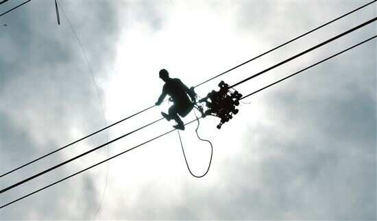 ■在凌绥高速电力线路迁改工程现场,国家电网辽宁朝阳供电公司工程技术人员在安装线上间隔棒。新华社发 |