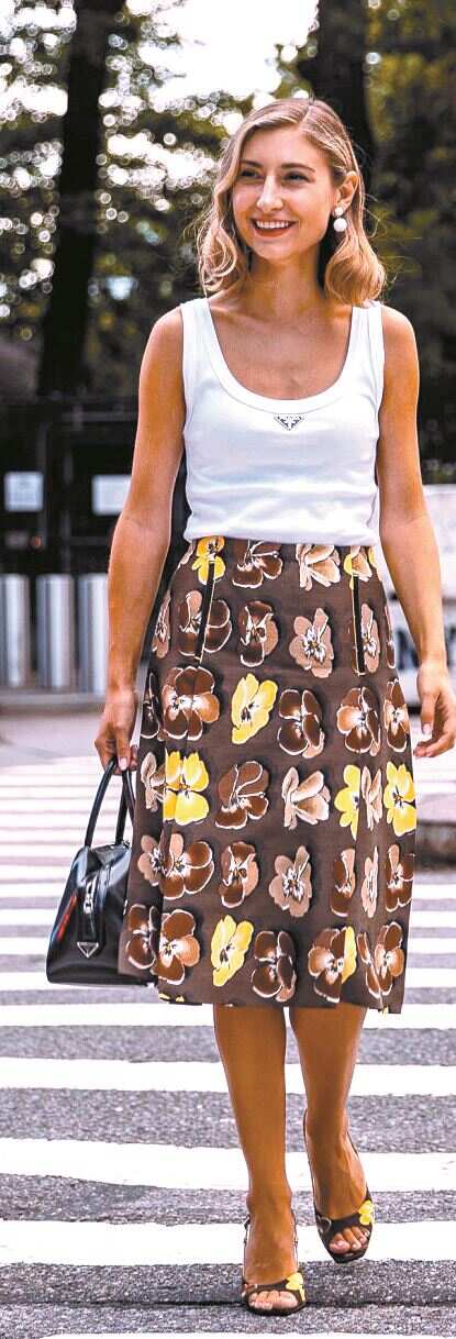 用印花裙搭法式小衫或“老头背心”,纯色并自带随性感的单品可弱化色彩和印花的繁复。 |