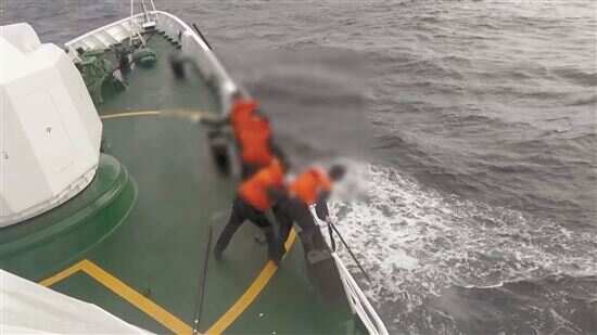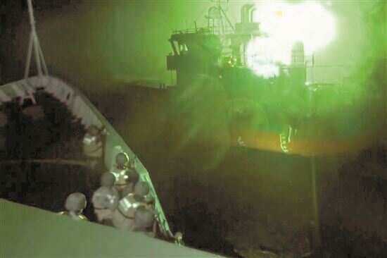 ■海上抓捕行动突击队员(左侧)在执法船上伺机跳帮登上目标渔船(视频截图)。 通讯员供图 |