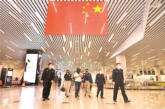 ■菲律宾执法人员押解嫌疑人从广州白云国际机场入境,将7名嫌疑人及物品移交专案组。 通讯员供图 |