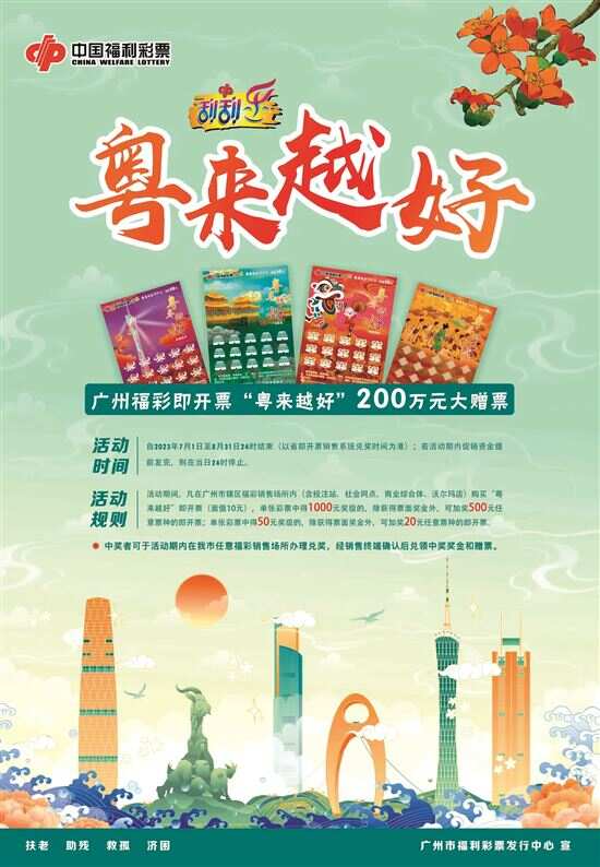 新快报讯 记者陆妍思 通讯员郭新庆报道 近日,广州市福利彩票发行中心发布公告,自7月1日起在全市范围内开展“粤来越好”即开票200万元大赠票活动,针对“粤来越好”即开票的两个奖级开展赠票。 活动期间,在广州市福彩销售站点内购买面值10元的“粤来越好”即开票且单张彩票中得1000元或50元奖级的,即可参加赠票。具体规则如下: 单张“粤来越好”即开票中得1000元奖级的,除获得票面奖金外,可加奖500元任意票种的即开票;单张“粤来越好”即开票中得50元奖级的,除获得票面奖金外,可加奖20元任意票种的即开票。活动自2023年7月1日启动,至8月31日结束,若活动期内赠票总金额提前达到200万元,则在当日24时停止。 据悉,“粤来越好”是广东省福利彩票发行中心设计、发行的一款即开票,也是广东福彩发展地方特色文化的力作。“粤来越好”取自谐音“越来越好”,寓意福利彩票事业始终秉持“扶老、助残、救孤、济困”的初心,积极募集公益金,为社会福利和公益事业发展作出贡献,让人民群众生活越来越好,祖国建设得越来越好。 广州福彩温馨提醒:本次赠票活动时间以销售系统实际兑奖时间为准,符合条件的中奖者,须在活动时间内到销售站点兑取赠票,若中奖者未在活动期内兑奖,则视为放弃赠票。 “粤来越好”即开票:最高奖10万元 “粤来越好”刮刮乐共有4款票面设计,均为10元面值彩票。票面图案分别为:与远处广州塔交相辉映的广州市花殷红似火“红棉花开”;在如黛青山和蓝天白云映照下、横跨韩江之上的潮州千年古桥“广济桥美”;国家级非物质文化遗产遂溪醒狮的“舞狮精彩”;色彩缤纷的客家鲤鱼灯寓意“年年有余”。 奖金方面,“粤来越好”共设6个奖级,奖金从10元到10万元不等。玩法方面,刮开覆盖膜,如果刮出“粤”图符,即可获得该图符下方所对应的奖金。中奖奖金兼中兼得。如果刮出“好”图符,即可获得玩法区内所有的奖金之和。每张彩票共有15次中奖机会。 寓意“人民生活越来越好、祖国建设得越来越好”的“粤来越好”刮刮乐,不仅好玩乐趣多,同时也是了解岭南文化魅力的新方式,还能为社会公益事业贡献一份力量。彩民朋友赶紧一试身手,收获快乐和幸运吧!