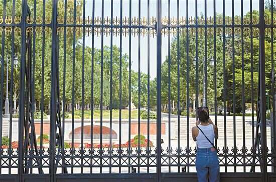 ■6月25日,一名女子在西班牙马德里因高温红色警报关闭的丽池公园外拍摄。 |