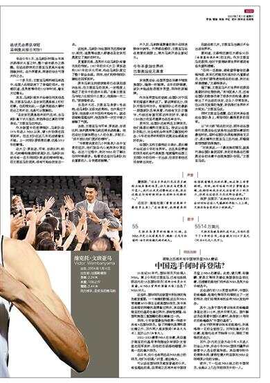 选状元必带队夺冠 马刺复兴指日可待? 早在今年5月,当马刺队时隔26年再次获得状元签之时,整个城市都为之沸腾。而远在欧洲的文班亚马更是兴奋地挥拳庆祝。在外界看来,两者的结合可谓天作之合。 一个多月后,文班亚马顺利被马刺选中,法国人在现场流下了幸福的泪水。他感叹道,选秀前等待的5分钟时间,着实太过漫长。 其实,马刺队根本不会做任何其他选择,文班亚马进入圣安东尼奥是板上钉钉的事。但即便如此,一名新秀面临大事时的忐忑和不安,也是可以理解的。 “圣安东尼奥是胜利的代名词,当马刺队拿下状元签后,我觉得自己真的非常幸运。”文班亚马这样说。 作为联盟中的老牌强队,马刺队自1976年进入NBA以来,曾5次夺得总冠军奖杯。但这支队伍近几年的战绩着实不堪。上一次球队晋级季后赛,还是2019年的事情。 在大卫·罗宾逊、邓肯、吉诺比利、帕克、伦纳德相继退役或离队后,马刺队始终没有一名引领球队前进的精神领袖。而文班亚马的到来,很有可能会改变这一点。 说起来,马刺队与法国球员还颇有缘分,帕克、迪奥等法国人都曾在圣安东尼奥度过了美好的时光。 更重要的是,选秀状元在马刺队有着优良的传统。1987年的状元大卫·罗宾逊和1997年的状元邓肯,均在马刺队度过了整个职业生涯。同样,他们均带领球队捧起总冠军奖杯。 原本马刺主帅波波维奇已在谋划退休生活,但文班亚马的到来,一定程度上推迟了老爷子的退休日期。“去拿文班亚马与他人比较没什么意义,他是独一无二的。”波波维奇说。 当选状元后,文班亚马身穿1号战袍,在马刺队主场完成亮相。也许是过于紧张,他连续3次中投均未能命中。就在场面略显尴尬时,他选择用一次空中接力缓解了气氛。 当晚,文班亚马与邓肯、罗宾逊、吉诺比利、埃利奥特等马刺名将共进晚餐。他还在社交媒体晒出5人的合影,并配文:“找不到比他们更好的榜样”。 “与前辈共度的几小时是我人生中宝贵的经历,他们发自内心地向我分享经验。在这个过程中,我对NBA的了解比任何时候都多。能看到这些对马刺队如此重要的人,令我感到鼓舞。” 不久后,马刺群星聚餐的照片在球迷群体中疯传。外界都在感叹:文班亚马站在前辈的肩膀上,将为马刺开启全新纪元。 今年不参加世界杯 巴黎奥运会见真章 东京奥运会,法国男篮在决赛中惜败美国队,摘得一枚银牌。去年的欧锦赛,该队未能战胜西班牙男篮,同样收获银牌。 作为世界篮坛的劲旅,法国队对于冠军的渴望不需多说了。要说牌面实力,球队无惧任何对手。根据球队公布的最新一期国家队名单来看,内线有戈贝尔镇守,外线还有富尼耶这样的好手,曾在CBA效力的亚布塞莱也在名单当中。 更何况,法国队还有两名王牌球员,他们是恩比德和文班亚马。按说以法国队的能力,完全有机会向世界之巅发起冲击,今年的世界杯和明年的奥运会都是绝好机会。 法国队主帅文森特近日表示,恩比德不会征战今年的世界杯。这名来自费城的球员有机会代表美国、喀麦隆和法国三支球队中的任何一支出战,但到目前他还没有做出决定。 而就在前几天,文班亚马也确认不会出战世界杯。 要知道,文森特还兼任大都会92队(法国篮球俱乐部)的主帅。作为文班亚马的恩师,他对于爱将缺席世界杯感到有些失望和遗憾。 “任何一名教练,都希望带着他的最强阵容,我早已把维克托视为队内重要成员,但我们要考虑他现在的处境,我对此深表遗憾。”文森特表示。 据了解,文班亚马不打世界杯的原因是要好好处理伤病。“我与医务人员,还有法国队的教练员做了很多次的沟通,最终做出了不出战的决定,这令人非常沮丧。但从球员发展的角度,我觉得打世界杯不太现实。”文班亚马说。 同时文班亚马透露,自己的未来会放在法国队身上,帮助球队赢得更多的冠军。 以“状元郎”现在的状态,明年在法国举行的奥运会应该是他出战国际赛场的最佳时机,届时法国队如果能够拥有戈贝尔、恩比德和文班亚马三名内线,那幅画面想想都觉得美好。 “对我来说,一个最完美的情况,就是代表法国队拿到冠军,我的目标是在巴黎奥运会的决赛中击败美国队夺冠。”文班亚马说。 维克托·文班亚马 Victor Wembanyama 出生:2004年1月4日 出生地:法国勒谢奈 身高:2.24米 体重:108公斤 臂展:2.44米 效力球队:圣安东尼奥马刺 【声音】 詹姆斯:“过去多年我们见过很多被称为独角兽的球员,但文班亚马更像是外星人,我们从未见过像他这么高,然后还能在打球时做到如此流畅与优雅的人。” 迈克尔·道格拉斯(曾拿过奥斯卡最佳男主角):“在法国时,我特意来到球馆观看维克托的比赛,他在场上非常聪明。同样,他对球场外许多事情感兴趣,我相信他成为状元后会有不小的压力,但别让这些压力压过那份喜悦。” 保罗·加索尔:“我相信NBA的球员们会好好给这些人气爆棚的年轻人上上课,文班亚马会受到不小的挑战。” 【数字】 55 文班亚马身穿的球鞋为55码,在NBA历史上仅有奥尼尔、鲍勃·兰尼尔和塔科·法尔的球鞋尺码比他大。 5514万美元 文班亚马被马刺队选中后,与球队签下了4年的合同,总金额为5514万美元(约为4亿元人民币)。 【同场加映】 周琦之后再未有中国球员登NBA赛场 中国选手何时再登陆? 20世纪80年代,国际球员开始涌入NBA。算上今年的文班亚马,已有包括姚明在内的13名国际球员(因部分