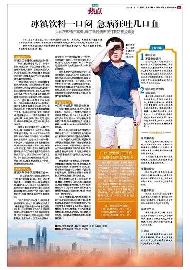 入伏在即连日高温,除了热射病市民还要防相关疾病 7月11日广东正式入伏,一年中最热的三伏天一共40天。长时间处于高温环境容易引起中暑、热射病、胃肠病、脑卒中等健康问题,如果不及时处理,甚至危害生命。 如何降低高温热浪对市民健康的影响?新快报记者采访了广州三甲医院急诊科、神经科等医生进行了解。 “高温症状”一 有环卫工中暑倒地确诊热射病 昨日,新快报记者采访了广东省中医院、南医三院、中山二院急诊科。科室相关负责人表示,目前还未正式入伏,会有晒后头晕、呕吐轻微不舒服症状的市民,随着高温天气的持续,要警惕中暑病例的增加。 “前段时间,接诊了一例病情转重的热射病患者。”珠江医院急诊科主任医师蔡学全则告诉新快报记者,这是一名从外地转诊过来的环卫工人,由于较长时间在户外工作,中暑昏迷倒地,转到珠江医院后,诊断为热射病,当即送入ICU,经抢救一周脱离了生命危险。 “热射病是中暑最重的一种情况,当时该名患者连续几天高烧40℃,通过各种方式,才将这种中枢型的高烧降了下来。其间出现无尿、肾衰、呼吸困难、昏迷等症状……”蔡主任提醒说,若出现头晕、头痛、发烧、恶心、气促、拉肚子、神志不清等症状,应立刻休息,并尽快就医。 蔡学全主任还建议说:“ 从事户外作业人群,如建筑工人、环卫工人、快递员等,应当避免上午10点至下午3点这段时间长时间在户外活动。”在中等强度作业活动中,应每15至20分钟喝1杯淡盐水,并适当补充含有电解质的饮品,避免饮用含糖量过多的饮品。敏感人群,如儿童、孕妇、老年人等要注意高温环境,户外工作者尽量避开在炎热的时间段工作。若必须在炎热环境下工作,尽可能在工作地点加设遮阳工具,开始工作后,循序渐进调整工作步伐,并适时在阴凉处休息。 “高温症状”二 高热天气下中风病例增三分一 一名60多岁的广州阿伯,炎热天气下散步后突发眩晕、恶心、呕吐进而意识不清……家属拨打120,将其紧急送院,确诊“中风”。中山大学孙逸仙纪念医院神经科脑血管病专科主任王艺东教授提醒市民,炎热天气时节除了要防热射病,也要预防高温天气下的脑卒中。 “五六月份广州入夏后,相关患者就不断增加,近一个月,医院统计进入‘绿色通道’可疑的脑卒中患者已接近300例,比平常增加了1/3。”王艺东教授指出,例如高热天气引发的缺血性中风,若不及时救治,可能会出现大面积脑梗死,危及生命。王艺东教授表示,业内常说“卒中救治延误减少一分钟,生命挽救一星期”。卒中救治每快1分钟,理论上就能多挽救190万个神经元,高热天气下如果发生中风,一样要紧急就医。 为何高热天气会引发脑中风?王艺东教授分析说,若在户外活动没有及时补充水分,会出现血液黏稠、血压上升现象,触发了卒中。他介绍说 ,三四十岁的年轻一族,在夏季夜生活丰富,熬夜也变得频繁,由于这些生活习惯的改变,再加上户外剧烈的运动、饮水不足等导致中风的病例也屡见不鲜,这些情况均值得警惕。 “高温症状”三 一口闷冰镇饮料竟致狂吐鲜血 冷饮、雪糕、冻奶茶,是不少人夏天的标配。但近日一个微博热搜却给大家敲响了警钟。因为天气炎热,黑龙江哈尔滨一男子,因为一口闷冰镇红茶导致贲门撕裂,佝偻着腰狂吐血,总量大概是1000毫升,命悬一线幸得医生及时抢救。 夏日炎炎,市民如果实在想喝冰饮料要注意什么?为何喝冰饮会口吐鲜血?新快报记者采访了医生进行解答。 广州中医药大学第三附属医院胃病科医生晏显妮表示:“冰镇饮料或者刺激性的食物,如果快速进入消化道,由于消化道黏膜受到强烈冷刺激,胃中血管急剧痉挛收缩,胃内压力骤然升高,从而易造成贲门撕裂,引起消化道出血。” 晏显妮进一步解释说,冷饮刺激,使胃黏膜屏障功能下降,患者很容易形成应激性溃疡,出现胃痛、胃胀、呃逆、呕吐等消化道症状。冰镇饮料甚至会引起胃痉挛,而导致机械性的物理损伤,即热搜里的贲门撕裂大出血。 晏显妮建议,若夏日出现长期胃痛、胃胀、反酸烧心、恶心呕吐、腹痛腹泻、便血等胃肠道症状时,千万不能大意而忽视它,应尽早去医院相关科室完善胃肠镜检查以明确诊断,做到“未病先防”“既病防变”。 “为了消暑降温,喝冷饮本身对身体不会有太大影响,但不要过量,有胃肠道等基础病的市民还是要慎吃。”珠江医院急诊科蔡学全主任表示,值得注意的是,有胃炎、胃溃疡、十二指肠溃疡等胃肠道、肝胆基础病的人群,最好忌口冷饮,因为容易对胃造成刺激,加重基础病。 广州“烧烤模式”开启全城悬挂黄色预警信号 新快报讯 记者许力夫报道 高温天持续,广州在太阳的猛烈照射下仿佛开启了“烧烤模式”。据了解,这样的高温炎热天气将持续一段时间,广州最近几天最高气温将达35℃~36℃,市民需注意防暑降温,及时补水,注意用火用电安全。 7月6日白天,广州市晴到多云,白天各区录得最高气温34℃~36℃,目前全市各区高温黄色预警信号正在生效中。预计,未来几天受副高加强控制影响,广州市维持高温炎热天气,最高气温35℃~36℃,相对湿度50%~95%。 ●广州市区天气预报 7月7日,晴到多云,27℃~35℃ 7月8日,晴到多云,27℃~35℃ 7月9日,多云到晴,27℃~35℃ 度夏锦囊 1 喝白开水不是最佳选择 汗液中主要的电解质是钠和氯离子,还有少量的钾和钙。长时间运动后,大量流失钠离子和氯离