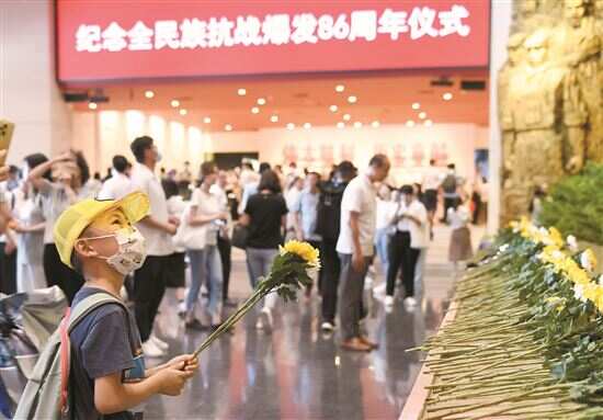 ■7月7日,一名小朋友在中国人民抗日战争纪念馆向抗战英烈献花。新华社发 |