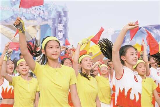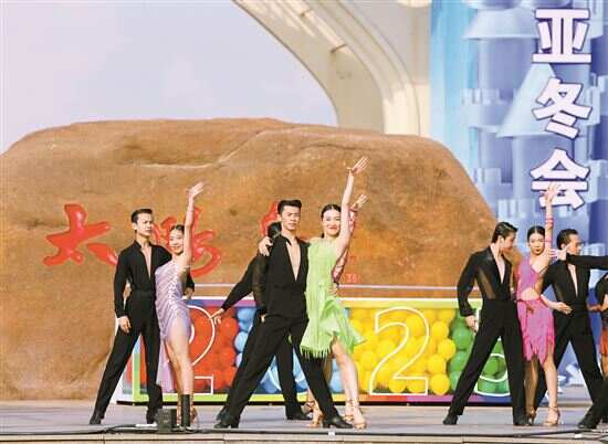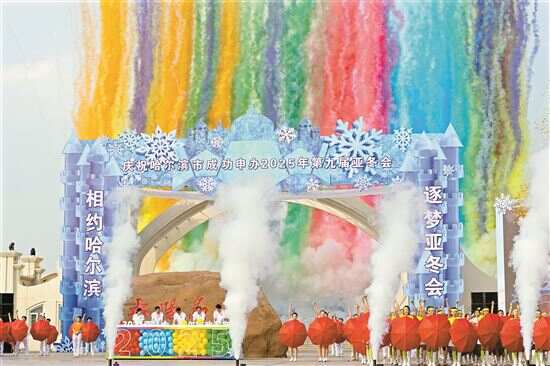 ■在哈尔滨市太阳岛景区太阳石广场,演职人员庆祝哈尔滨市获得2025年第九届亚洲冬季运动会举办权。 |