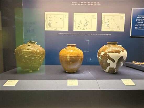 ■“从广州出发”展览现场。左,南海窑“潘宅号” 印文酱釉四耳罐,佛山南海奇石村窑址采集,宋。中,南海窑“吴字号”印文酱釉四耳罐,“南海I号”沉船遗址出土,南宋。右,南海窑“徐赀立”印文酱釉四耳罐,越国宫署遗址出土,宋。潘玮倩摄 |