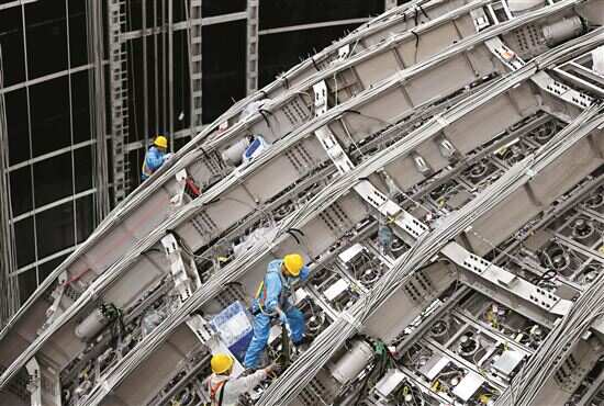 ■工作人员在探测器的不锈钢结构上进行安装作业。 |