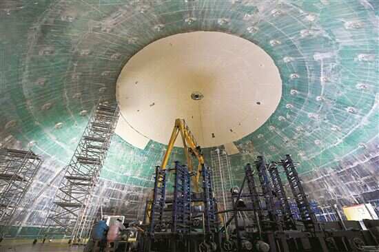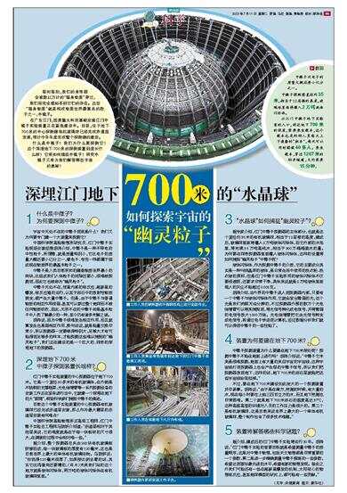 每时每刻,我们的身体都会被数以万计的“隐身物质”穿过,我们却完全感知不到它们的存在。这些“隐身物质”就是构成物质世界最基本的粒子之一:中微子。 在广东江门,国家重大科技基础设施江门中微子实验装置正在紧张建设中。目前,位于地下700米的中心探测器有机玻璃球已经完成赤道层安装,预计今年年底完成整个探测器的建设。 什么是中微子?我们为什么要探测它?这个深埋地下700米的探测装置到底长什么样?它将如何捕捉中微子?研究中微子又将为我们解答哪些宇宙的奥秘? 1 什么是中微子?为何要探测中微子? 宇宙中无处不在的中微子到底是什么?我们又为何要专门建一个大装置来探测它? 中国科学院高能物理所研究员、江门中微子实验现场安装经理胡涛介绍,中微子是一种不带电的中性粒子,所谓微,就是质量特别小,它比电子的质量大概还要小亿分之一,像电子、夸克一样都属于组成现在物质界的最基本粒子之一。 中微子是人类目前所知的建造物质世界最小的砖块,比组成我们人体粒子的间隙还要小,很难被探测到,因此它也被称为“幽灵粒子”。 中微子无处不在,恒星内部的核反应,超新星的爆发,核反应堆的运行,以至于岩石中的放射性物质衰变,都产生大量中微子。但是,由于中微子与普通物质的相互作用很弱,甚至可以穿过整个地球而不被任何物质吸收,因此,无所不在的中微子却是基本粒子中人类了解最少的一种,至今仍有诸多未解之谜。 胡涛说,因为中微子很难发生相互作用,而且就算发生也是弱相互作用,换句话说,就是能量交换非常少,所以探测器一定要做得特别大,足够大才有可能得到足够多的样本,才能探测这些难以捕捉的“幽灵粒子”,我们正在建设的是一个巨大的、球形的深埋地下的探测器。 2 深埋地下700米 中微子探测装置长啥样? 江门中微子实验装置的中心探测器位于地下700米。它是一个直径30多米的有机玻璃体,在外侧是不锈钢的支撑框架,光电倍增管等一系列探测设备的安装工作正在紧张进行当中,它就像一个深埋在地下的大“眼睛”,帮助科学家们捕捉中微子的痕迹。 目前这个中微子实验装置的中心探测器有机玻璃球已经完成赤道层安装,那么作为最大圈层的赤道层安装有何难点? 中国科学院高能物理所正高级工程师、江门中微子实验总工程师马骁妍介绍道:“赤道层相对于其他层来说,它的难度就是在于每一块板材的尺寸很大,在调装的过程中会相对难一些。” 据介绍,整个探测器总共由263块有机玻璃板拼接而成,每一块玻璃板的厚度有120毫米,这也是目前世界上最大的单体有机玻璃结构。马骁妍说:“你觉得120毫米很厚了,如果按比例去看的话,其实它比鸡蛋壳还要薄的,(因为)未来我们站的这个地方就是液体闪烁体,两万吨的液体闪烁体在有机玻璃球里面。” 3 “水晶球”如何捕捉“幽灵粒子”? 据专家介绍,江门中微子探测器的主体部分,也就是这个直径约35米的有机玻璃球,相当于12层楼的高度,建成后,玻璃球里面将灌入2万吨液体闪烁体,而它外部的水池里,将充满3.5万吨高纯水,相当于300万桶桶装水的量。为何要在球形探测器里面灌入液体闪烁体,这样的设置将如何捕捉“幽灵粒子”中微子呢? 液体闪烁体,作为探测中微子的介质,它的主要成分其实是一种叫烷基苯的液体,是日常生活中使用的洗衣粉、洗衣液的原料,但是江门中微子实验所用的液体闪烁体不仅要很透明,还要求非常干净,具体来说就是2万吨液体里面混入的灰尘不能超过0.008克。 胡涛介绍,当外界的中微子进入到探测器内部,只要有一个中微子与液体闪烁体作用,它就会发出微弱的光,这个光是我们肉眼无法分辨的,不过探测器外围的数万个光电倍增管可以将其捕捉到,将光信号转化成电信号,并将微弱的电信号放大1000万倍。光电倍增管把它由光信号转变成电信号,再通过电子学送到计算机,经过数据分析我们就可以得到中微子的一些性能了。 4 装置为何要建在地下700米? 中微子探测装置为什么要建在地下700米深处呢?探测中微子不能在地面上进行吗?胡涛介绍说:“中微子它本来是很难探测,地面上有大量的来自宇宙的宇宙线,这种宇宙线打到探测器上也会产生假的中微子信号,所以我们把探测器放到地下,这样的话,地下700米的岩石层就能把这些宇宙线给阻挡掉。” 不过,要在地下700米建设如此庞大的一个探测装置并非易事。胡涛说:“由于是在南方,挖掘的时候,有大量的水,现在每小时要往上抽三四百立方的水,而且地下挖掘也非常困难。第二个就是地下700米岩石的温度高达37℃,这种高温高湿的环境对人员的工作压力是很大的。第三个是有机玻璃球,这是目前来说世界上最大的一个单体有机玻璃球,整个制作包含了很多技术难题。” 5 装置将解答哪些科学谜题? 据介绍,建成后的江门中微子实验将运行30年。胡涛说:“江门中微子实验的首要目标就是希望测量中微子的质量顺序,这是对中微子物理,包括天文物理都是非常重要的一个参数,第二是进一步精确测量中微子振荡的一些参数,希望达到国际最先进的水平,希望有新的物理发现。除此之外我们可能还有一些在超新星爆发的机制、太阳核心的物理核反应,甚至地球模型的研究上,都可能有一些贡献。” 【数说】 中微子比电子的质量大概还要小亿分之一。 中微子探测器直径约35米,相当于12层楼的高度,