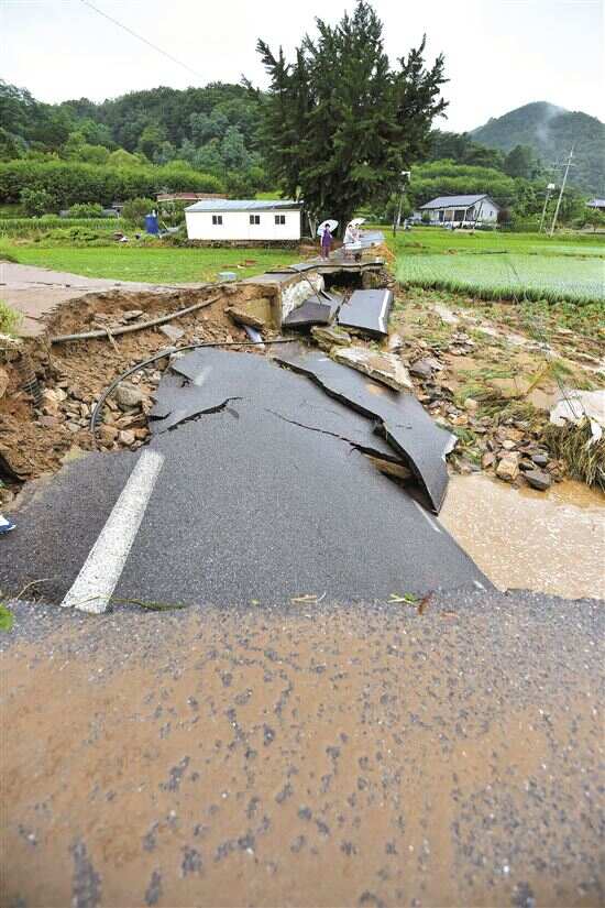 这是7月15日在韩国庆尚北道醴泉郡拍摄的在暴雨中坍塌的道路。新华社发 |