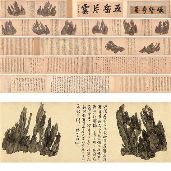 ■2020年10月,北京保利春拍,5.129亿元成交的明代吴彬《十面灵璧图卷》(上为完整作品,下为局部) |
