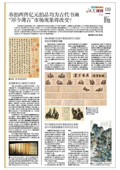各地春拍已经陆续举槌,北京、上海等地的艺术拍场纷纷拿出了不俗的“成绩单”。收藏周刊记者注意到,2023年春拍,截至目前过亿元拍品仅有3件,其中两件为古代作品,分别是以1.817亿元成交的赵孟頫小楷《临黄庭经》、以1.91亿港元(约1.74亿元人民币)成交的《画中九友集册》,另外一件则是在香港苏富比以2.51亿港元成交的张大千《花开十丈影参差》。而过去多年亿元大热门的近现代书画,在内地拍卖市场却“颗粒无收”,这是否预示着过去内地艺术市场“厚今薄古”的现象将改变?艺术市场研究专家牟建平在接受收藏周刊记者采访时表示,“两件古书画拍品过亿,并不能说明古代书画就转热了,我认为只是偶然现象。” ■收藏周刊记者 梁志钦 赵孟頫书法小楷超亿元成交 日前,在北京保利2023春拍“仰之弥高——古代书画夜场”中,元代赵孟頫《临黄庭经》以1.58亿元落槌,加佣金以1.817亿元成交,成为2023春拍中国古代书画高价拍品之最。这也是继2019年,2.67亿元成交的行书《致郭右之二帖卷》之后,赵孟頫又一件过亿元成交的书法作品。 谈及赵孟頫本身的书法特点,牟建平以故宫博物院藏的赵孟頫作品分析表示:“赵孟頫书法的主要成就在行书,但他的小楷写得也很好,《道德经》《汲黯传》,工整秀丽,不失灵动。他取法高古,师法钟繇、王羲之、王献之,点画遒劲,结体紧密,尤其难得处在于楷书有行楷的笔意,用笔跳动、书格古雅,令后人称赞。他的行书学李北海,既有李北海的雄劲健笔,也有自己个人的风神秀美,融二为一,由此成为元代首屈一指的书法大家。” 本次春拍的另一件亿元拍品来自嘉德香港推出的《众山皆响——画中九友集册》专场中。“画中九友”源于明末清初诗人吴伟业对董其昌、王时敏、王鉴等九位文人画家的赞颂。至20世纪,重要鉴藏家吴湖帆耗费巨资,历时十五年终于实现其将“画中九友”画册搜罗全豹的心愿。此九册,计103开,吴湖帆统一装池、题签。本次专场由京港两地连线拍卖,香港主拍卖官从8800万港元起拍,通过屏幕,京港两地买家举牌叫价,最终成交价为1.9113亿港元(约1.74亿元人民币)。最终竞得的是通过电话委托竞投的北京买家。 在今年春拍,近现代书画仅有的一件亿元拍品,是4月份在苏富比亚洲50周年呈献的连场晚拍中,首现拍场的张大千泼彩荷花《花开十丈影参差》,最终以2.516亿港元成交。 两大拍卖行近现代书画没有亿元成交 原因或是藏家惜售 值得注意的是,本届春拍的嘉德和保利两大拍卖行的亿元成交作品均为古代书画,以往亿元拍品大热的近现代书画板块中,却不见亿元身影。艺术市场过去多年均流传着“厚今薄古”的现象(亦即近现代以及当代的作品价格比古代作品要高),而这一次似乎有点不一样,这又透露出怎样的艺术市场信息? 对此,牟建平对收藏周刊记者分析说:“两件古书画拍品过亿,并不能说明古代书画就转热了,我认为只是偶然现象,总体看,国内拍场近现代行情还是比古代书画要热,出现亿元拍品的数量明显要多。” 从常理看,古代作品经过历史的沉淀与验证,能流传至今的名家作品,都是经过千锤百炼的,无论是价值上还是价格上,一般都会比近现代乃至当代的作品高。但以往为何会存在“厚今薄古”的现象?牟建平认为,“首先与藏家或投资客对古代书画缺乏认知有关,收藏古代书画,需要更多的艺术品鉴赏与真伪鉴别能力,这个需要时间,并不是短期介入就能掌握的。其二,必须承认目前古书画拍品赝品还是较多的,影响了古书画价格行情。其三,重量级的古书画目前都保存在博物馆,民间藏品数量不多,限制了古书画高价的出现。” 对于本次春拍内地两大拍卖行在近现代书画方面没有出现亿元拍品的问题,有行内人士则坦言,三年疫情影响过后,今年放开,不少藏家纷纷愿意拿出作品上拍,在作品征集上选择明显增多,但对特别好的作品,藏家还是惜售,不少人在观望,“可以理解为,近现代书画没有亿元成交的原因更多的是因为不少好作品并没有拿出来。” 千万级拍品近现代书画依然占多数 迄今中国书画最高价为齐白石作品 收藏周刊记者尝试在千万元级的拍品中进行对比,到底古代书画与近现代书画所占比例如何?收藏周刊记者发现,在北京保利30件千万元级拍品,古代书画10件,近现代书画同样是10件,但值得一提的是,在最高价前十中,古代书画则占六席,而近现代则只有两件。 而在中国嘉德41件超千万元成交拍品中,中国书画部分占20件,近现代书画则有15件超千万成交,而在该场次中的前十中,近现代书画也占八席。 而在上海嘉禾2023春拍,过千万拍品则有17件,据其官方公众号显示的9件过千万的中国书画中,只有1件是古代书画。 由此可见,在千万元级的拍品中,总体依然存在“厚今薄古”的现象。 从以往的成交纪录看,古代书画过亿成交的也不在少数,第一件拍卖成交过亿的中国古代书画作品当数2009年以1.6912亿元成交的明代吴彬《十八应真图卷》,而至今古代书画成交最高价同样是吴彬作品,2020年北京保利春拍,《十面灵璧图卷》最终以5.129亿元人民币成交,超过了2018年以4.636亿港元成交的苏轼《木石图》。 但在中国书画领域,成交最高的依然在近现代板块,2017年12月17日晚,北京保利十二周年秋季拍卖会的“震古烁今——从北宋到当代的中国书画”专场拍卖中,齐白石的《山水十二条屏》以8.1亿元落槌,加佣金