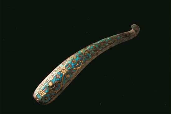 ■龙首错金几何纹镶嵌松石青铜带钩 |