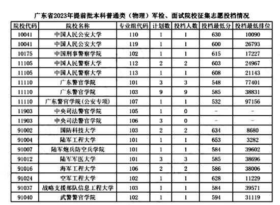 广东省2023年提前批本科普通类(物理)军检、面试院校征集志愿投档情况 |