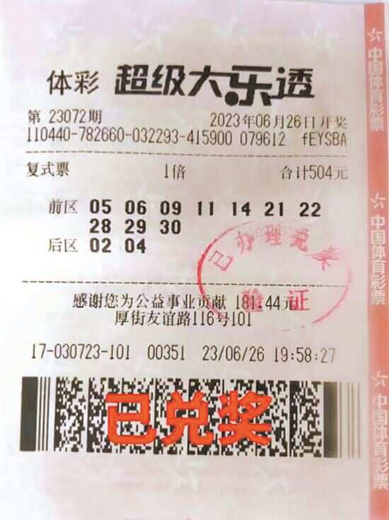 “不中奖也有奖”活动加持 新快报讯 记者陆妍思 通讯员陈汝钰报道 近日,广东体彩乐透一“夏”超级大乐透不中奖也有奖活动持续为购彩者加持好运,这不,东莞购彩者就实实在在收获了一份消暑大惊喜,中出1009万元,快来沾沾喜气 冲着赠票活动购买复式 体彩超级大乐透第23072期开奖,摇出中奖号码:前区“05、06、09、11、14”;后区“02、04”。本期全国共开出3注一等奖,其中1注1000万元基本投注一等奖花落东莞厚街友谊路4417030723体彩实体店, 中奖者张先生(化姓)凭借一张504元的“10+2”复式票,除喜中一等奖1注外,还中出多注固定奖,单票总奖金1009万元,贡献个人偶然所得税200万元。 近日,张先生来到东莞体彩中心成功办理兑奖。他说自己与中国体育彩票结缘已有10多年时间。“这次中得大奖,更多是在赠票活动的加持下尝试购买复式票的收获。”张先生坦言,平时他也有买大乐透,每次都是10元、20元左右, 这次派奖活动规定购买500元及以上,就有150元的赠票,而且觉得复式票中奖机会也会多一些,所以才选择买了“10+2”复式票。 对于如何选号张先生表示,平时选号没有什么技巧,有时机选,有时自选,这次中奖的号码,就是全凭灵感选出来的。“我的幸运数字是‘05’,所以这次第一个号码就选了‘05’,本来打算用这组号码连续投注5期,没想到刚好在购买第5次就中了!”刘先生激动地表示,“知道中奖我整宿都没睡着,太激动了!” 对于奖金的使用,张先生表示这笔奖金来得正是时候,家里的孩子都在上学,现在可以用这笔奖金规划一下,一部分用于小孩的教育和兴趣培养,一部分用于将来资助儿女,或作养老储备金之类。 旺站庆祝吸引街坊围观 7月4日下午,东莞体彩中心负责人到4417030723体彩实体店颁发“幸运投注站”牌匾,并请来舞狮队到场庆贺。虽然下着毛毛雨,热闹的场面仍吸引不少附近的街坊围观,大家纷纷上前道喜,顺便买几注彩票沾沾喜气。 目前,乐透一“夏”超级大乐透不中奖也有奖2600万元营销活动正在进行中,购彩者在广东体彩实体店购买超级大乐透彩票单票单期票面金额符合指定条件且不中奖的,可获得对应金额的赠票。赠票标准如下:单票单期票面金额120元(含)-249元(含),不中奖可获赠票20元;单票单期票面金额250元(含)-499元(含),不中奖可获赠票60元;单票单期票面金额500元以上,不中奖可获赠票150元。如果该张彩票中奖但奖金金额低于上述赠票金额,购彩者可获得差额部分的赠票。例如活动期间购彩者单票单期购买超级大乐透252元且中得30元奖金,则还能获得30元赠票。 赠票不能用于投注竞彩游戏。多期票、预售票、套票不参与活动。欢迎有兴趣的朋友们来广东体彩各大实体店投注,同时也提醒购彩者,活动虽好,投注也要保持理性。而您所购买的每一张彩票,都会贡献一份爱心。 快乐购彩,理性投注。毕竟中大奖是小概率事件,我们要保持一颗平常心、娱乐心、公益心来体验大乐透游戏。您所购买的每一张彩票,都会贡献一份爱心。以2元1注的体彩大乐透为例,就有0.72元成为彩票公益金。这些公益金用于补充全国社会保障基金、乡村振兴、教育助学、医疗救助、红十字事业等民生领域。作为国家公益彩票,为体育事业和社会公益事业助力,是中国体育彩票发行的初衷,更是一种社会责任担当。