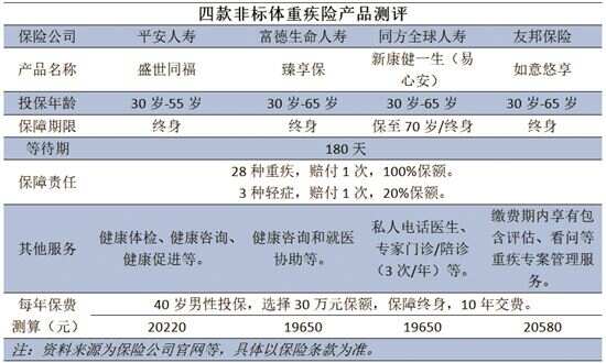 新快报讯 记者林广豪报道 7月18日,平安人寿推出限量的亚健康专属重疾险,主打投保简易。据记者不完全统计,去年以来,友邦人寿、同方全球人寿、富德生命人寿等都已推出此类产品。有观点认为,非标体产品将成为健康险长期经营的重要增量市场。 非标体保险市场成蓝海 据了解,投保人身险往往需要较详细的健康告知,若健告情况有异常,核保的结果常为除外承保、加费承保,甚至拒保,这类带病人群在业内被称为“非标体”或“次标体”。由于该类人群的健康险选择有限,此种产品的营销往往伴随着“非标体的福音”等。 记者看到,平安人寿此次推出的“盛世同福”,主打亚健康定制和投保更简易,如甲状腺结节、乳腺结节等亚健康人群均可申请投保,“告别加费和除外”。有业内人士告诉新快报记者,由于非标体赔付风险高,保险公司对该种产品的开发较为谨慎。 记者注意到,近年来非标体健康险产品频现,重疾险中尤为突出。2022年11月,友邦人寿推出国内首创简易核保重疾产品“如意悠享”,创新覆盖亚健康人群。今年3月,同方全球人寿的“新康健一生(易心安)”重大疾病保险上市,为亚健康人群提供保险保障。7月,富德生命人寿的“臻享保”重大疾病保险上市,为该公司首款非标体可投保产品。 东亚前海证券一项研报指出,非标体保险市场有望成为下一个险企竞争的蓝海市场。 “28+3”为行业基本要求 记者梳理发现,上述四款产品在多方面高度相似。比如,对疾病的保障范围均为行业基本要求——28种重大疾病和3种轻症疾病,重疾赔付100%保额,轻症赔付20%保额,均限制为1次赔付。不同的是,“盛世同福”不保障全残,其余三款是身故、全残、重疾三赔一。在业内看来,上述均体现出险企探索的保守。此外,对健告做减法也是统一步调,四款产品均表明健告只需回答3个问题。 而与普通重疾险相比,四款产品投保年龄的下限均提升至30岁,最高保额的上限仅为30万元。其中,“臻享保”和“新康健一生(易心安)”还限制56岁-65岁人群的最高保额为20万元。 北京工商大学经济学院课题组的研究认为,我国的非标体健康险产品仍处于创新发展阶段,还存在诸多问题:经验数据不足,产品定价困难;精准场景缺乏,客户难以触达;标准规则复杂,风控体验不佳;短期亮点较多,长期迭代不易。课题组建议,非标体健康险应根据投保人的疾病进展率确定不同的基准价格;扩大被保险人覆盖范围,满足更广泛的客户需求。