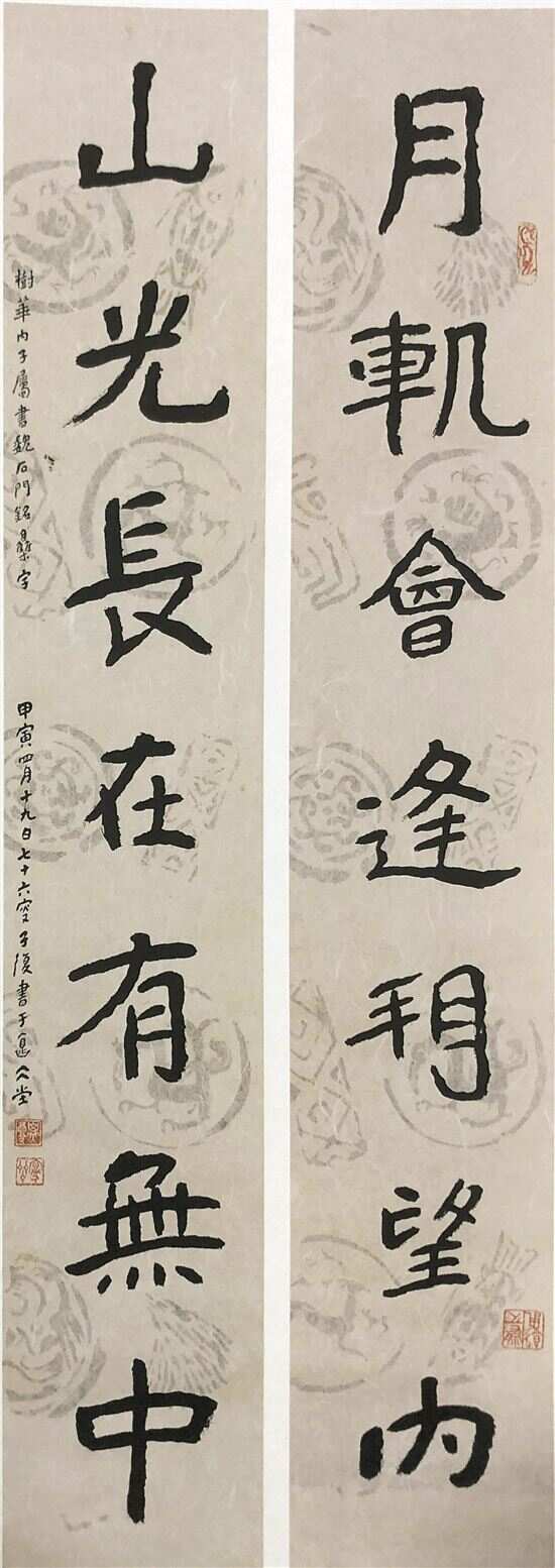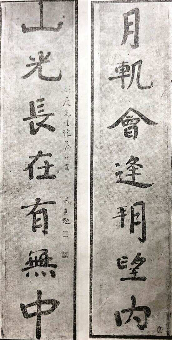 ■两幅《石门铭集字联》,右为林直勉作品,左为吴子复作品,体现了岭南书法碑学的传承 |